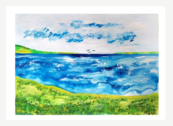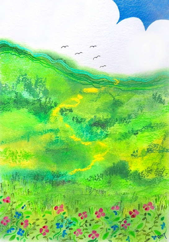 Never ending shades of blue with distant birds searching the greenery. Colourful flowers buzzing with new life