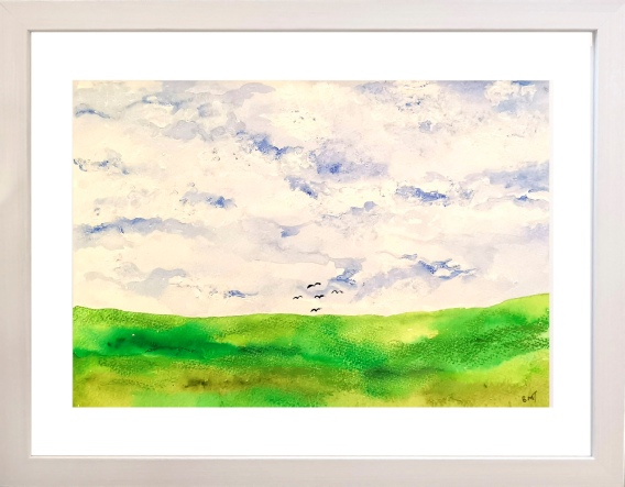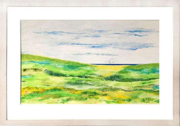 Original painting in acrylic and pastel on textured paper. Framed size: